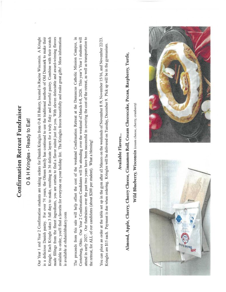 All proceeds will offset costs of the confirmation classes retreat to the Damascus Catholic Mission Campus. Kringles will be sold after all Masses the weekends of November 8/9, November 15/16, and November 22/23. You may also print the order form and return it to the parish or school office. Thank you for your support of our Confirmation Class.